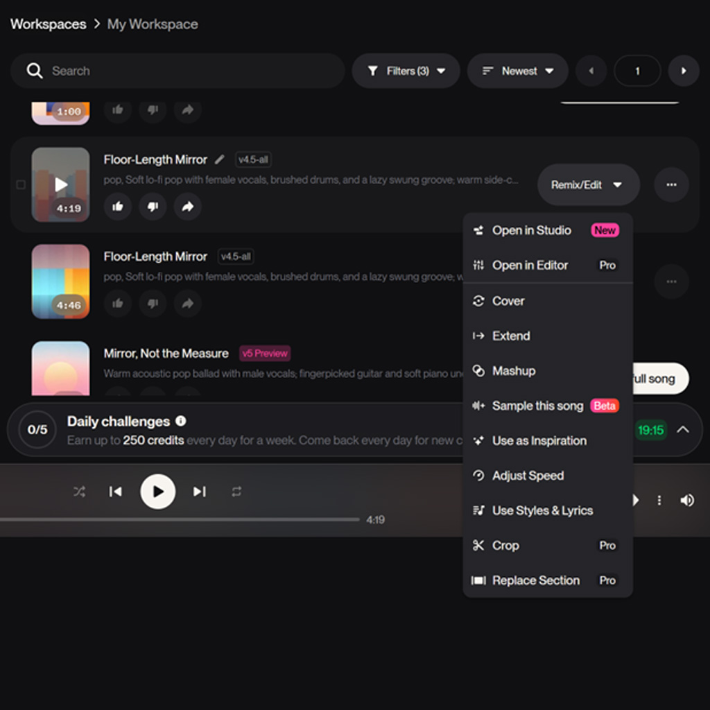 Here are screen recordings of the songs it generated. The first recording includes snippets of songs I could get by paying extra money.