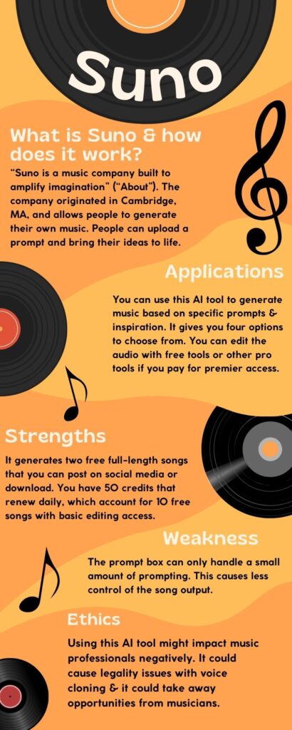 Reason: The voices generated along with the songs sound very realistic, which has caused people to feel uneasy about music-generating tools. First, the lifelike nature of an AI bot and the music it generates might eliminate the need to collaborate with an actual songwriter and singer. This may take away opportunities from those who do have songwriting and poetry gifts. Second, this tool may cause others to become lazy. Instead of working hard to develop poetry and song writing skills, people might turn to a robot out of convenience. Therefore, they might have impressive work to show others, but they have not grown as human beings in the process. Third, Suno and other AI music generating services have faced lawsuits and legality issues based on their use of copyrighted songs for training data (“Record Companies”). Therefore, I believe music produced by an AI tool should not as the final product. Instead, it should be used as a guide to help people see the potential in their work. I believe generating a song with AI and then having someone with musical talent re-record the song with their unique style could be one way to use Suno ethically.